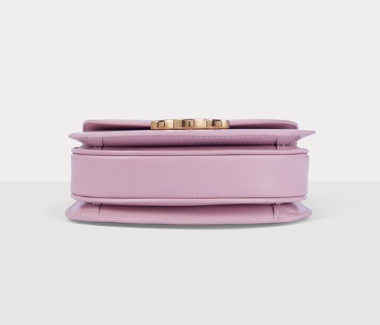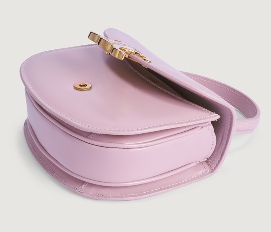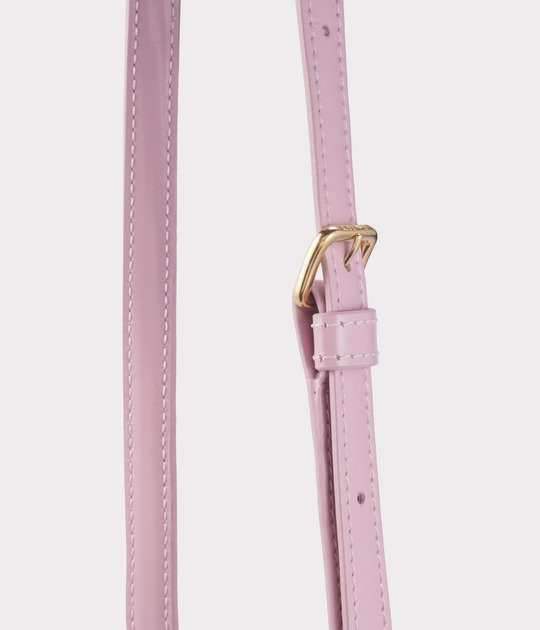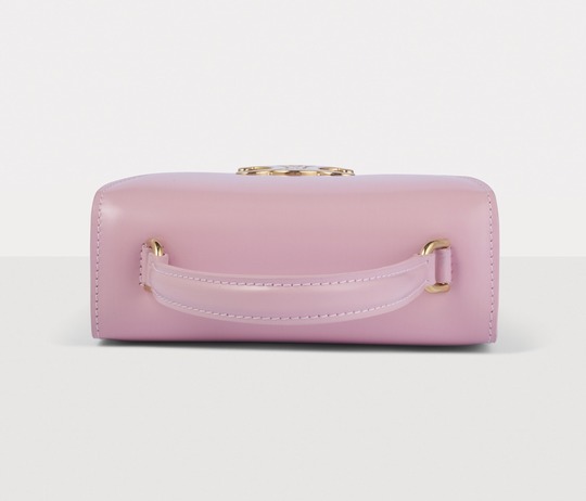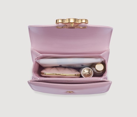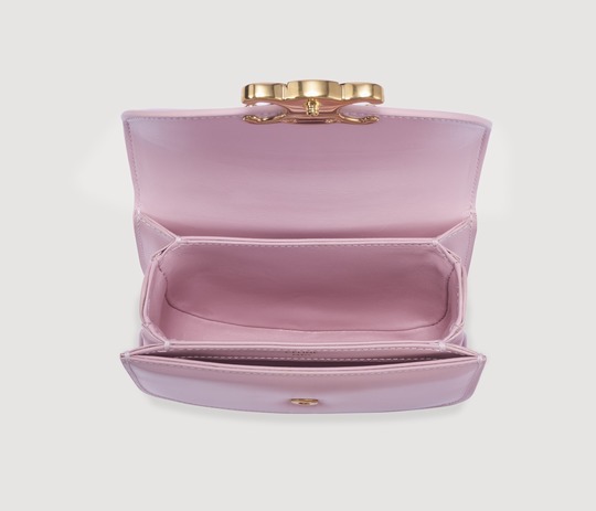 The entire bag is made of light pink calfskin . The delicate and shiny leather has a creamy texture , and the pink tones exude a romantic and cute atmosphere.