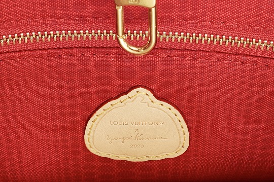 The bag is lined with red cotton canvas printed with Yayoi Kusama's iconic pumpkin polka dot pattern . A pumpkin-shaped LOUIS VUITTON × Yayoi kusama 2023 embossed leather label is sewn on the back zipper pocket, indicating the artist collaboration of this bag. The metal hook enhances security.