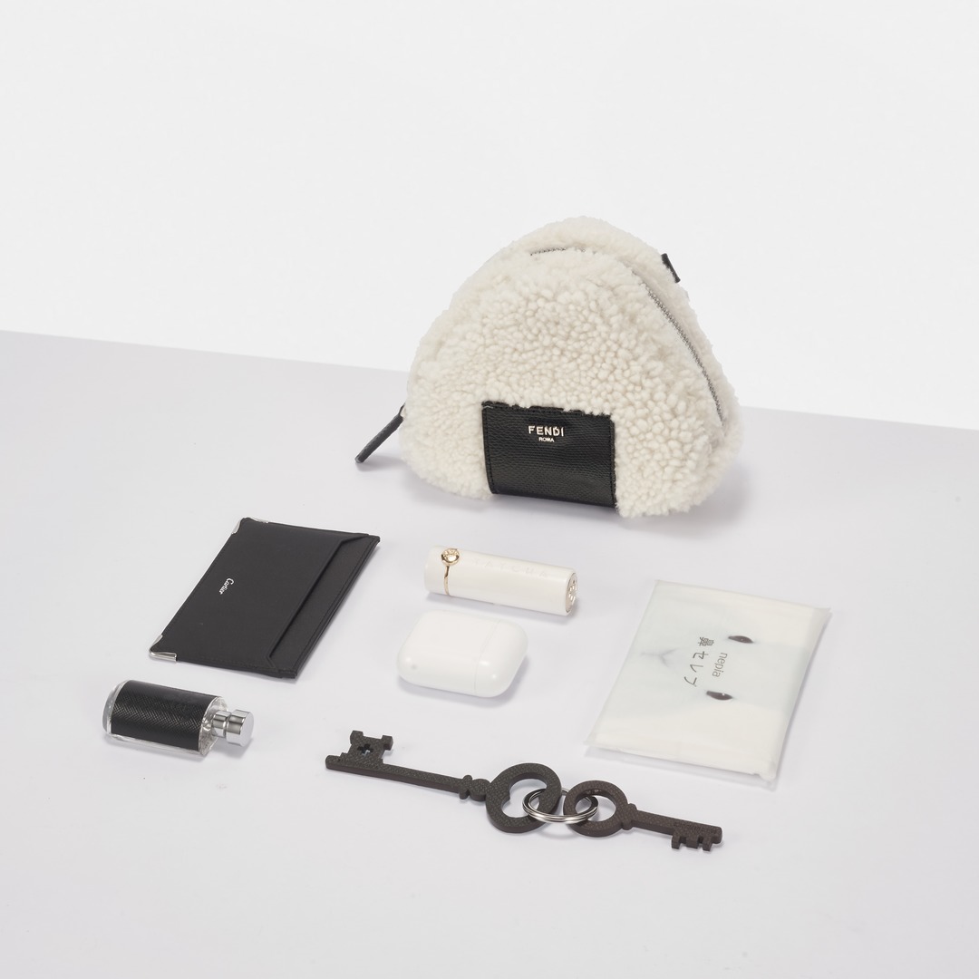 The bag is lined in deep black, with a logo patch as the finishing touch. This rice ball can be filled with a lot of stuff. We put lipstick, perfume, earphones, card holder, keys and tissues in it. The necessary small things can be easily put in . You can have fun with a mobile phone and a rice ball when you go out.