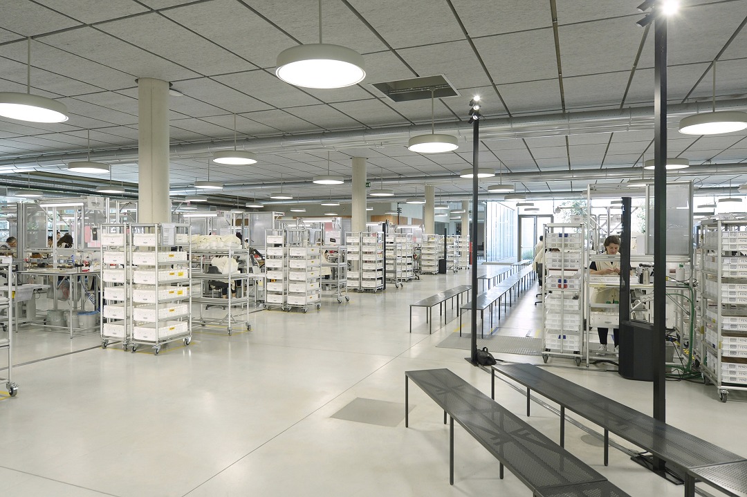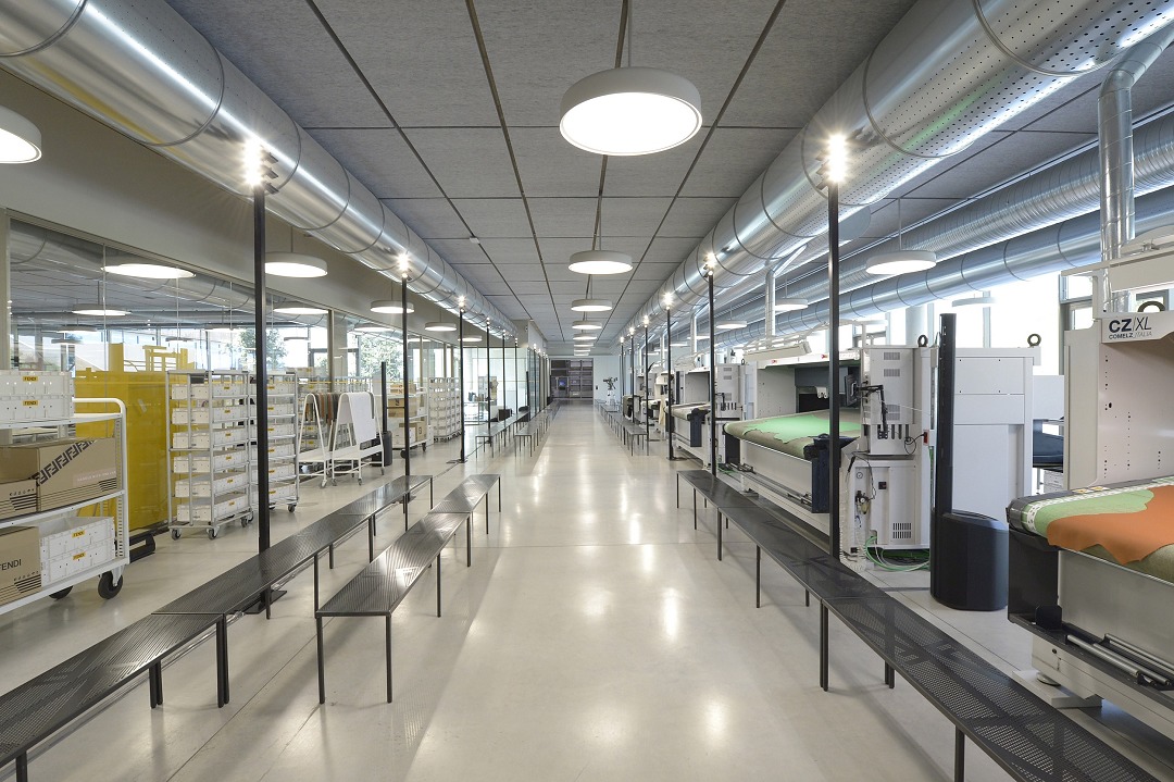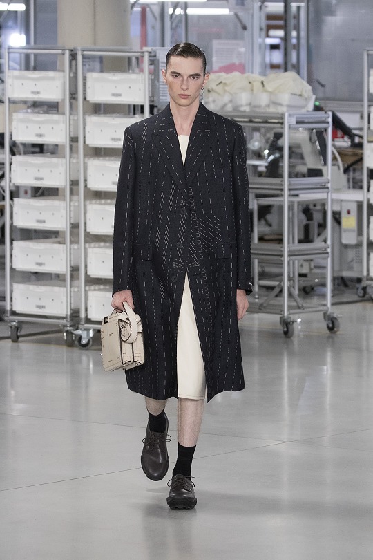 The FENDI Factory leather goods workshop located in the Tuscan countryside was completed and opened in October 2022. The workshop covers an area of 8 hectares and adopts earth-tone concrete exterior walls that echo the surrounding environment. Surrounded by newly planted olive trees and local vegetation, it blends in with the mountain vegetation. This season's men's show uses the workshop atrium as the T stage, and models shuttle between the craftsmen's workbenches, presenting the eternal fusion of mechanical products and handicrafts.