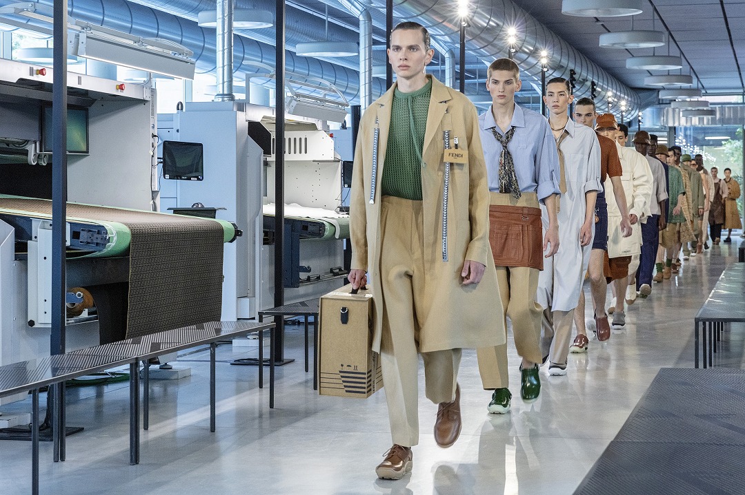 FENDI's 2024 Spring/Summer menswear collection is themed "Artisan" , drawing inspiration from the FENDI Factory leather workshop outside Florence and the scenery of Tuscany, incorporating design elements such as aprons and work belts into menswear, showcasing a combination of Italian elegance and practical workwear style.