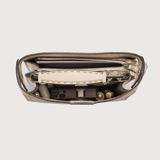 The size of the Peekaboo ISeeU mini handbag is 26×25×10.5cm , which is a relatively compact and portable size for men. The bag has two compartments inside, which are opened and closed by a rectangular twist lock on the front and a zipper on the back, ensuring privacy and security. There is a detachable inner pocket on the middle partition , which can be flipped to switch between the same color leather or FF canvas.